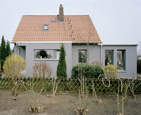 Das kleine weiß verputzte Siedlungshaus aus den 60er Jahren mit nur 86m² Wohnfläche wurde um einen eingeschossigen Anbau erweitert. Dort befinden sich nun zwei Kinderzimmer, die vom Wohnungsmittelpunkt, dem kombinierten Wohn-/ Ess-zimmer, aus erschlossen werden. Die Küche wurde in den benachbarten Raum verlegt und mit einer Durchreiche an den Essbereich angebunden.