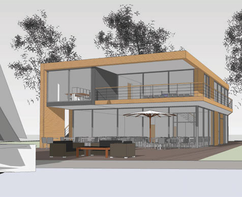 Das neue Segler-Vereinsheim sucht die Nähe zur Wasserkante, dem attraktivsten Ort auf dem Grundstück. Der Baukörper positioniert sich entsprechend der umgebenden Bebauungsstruktur senkrecht zur Birkenallee. So wird ein direkter Bezug zum Wasser hergestellt. In Richtung Wasser verschwenkt der Baukörper. Er folgt damit der dominierenden Blickrichtung auf das Steinhuder Meer mit ungehindertem Ausblick auf das Wasser und das gegenüberliegende Ufer. Der sparsame Platzverbrauch und die Orientierung des Gebäudes erlauben ein ungestörtes Nebeneinander von geselligen und sportlichen Aktivitäten sowie die Bereitstellung von zusätzlichen Landliegeplätzen. Von der Seeseite aus heißt die Segler-Messe mit der Seeterrasse den Gast willkommen. Die Terrasse bildet den Dreh- und Angelpunkt der Anlage, von hier aus erlebt man im direkten Kontakt zur Gaststätte den Blick auf das Meer und kann zugleich das Kommen und Gehen der Segler und die Arbeit an den Booten verfolgen.